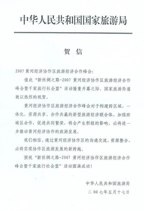 2007黄河经济协作区旅游经济合作峰会隆重开幕 何鲁丽、国家旅游局发来贺信(2007年05月18日)