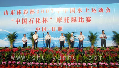 8月29日上午, 2007年中国水上运动会摩托艇比赛开幕式在水运基地举行。出席本次开幕式的有:国家体育总局水上运动管理中心五部部长许四海、项目主管朱志娜,日照市体育局副局长丁明春、副调研员卜文利,水运会摩托艇比赛总裁判徐应恺,中石化日照分公司总经理助理贺培玉,以及组委会有关部室的负责人。开幕式由组委会竞赛部执行部长刘家坤主持,许四海做重要讲话。