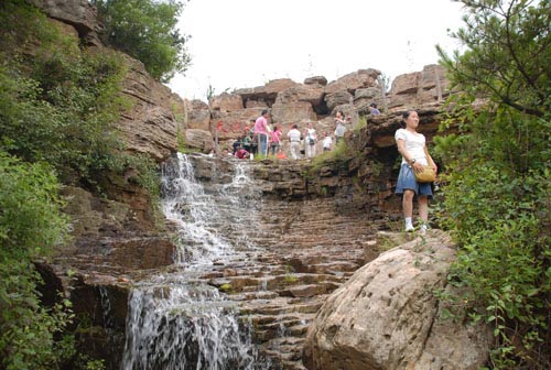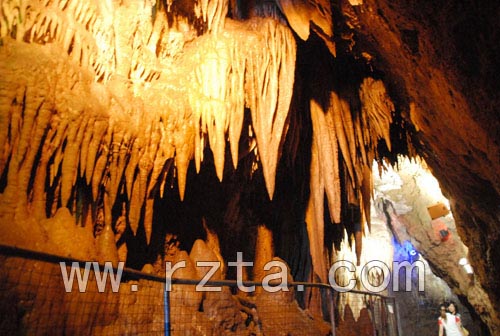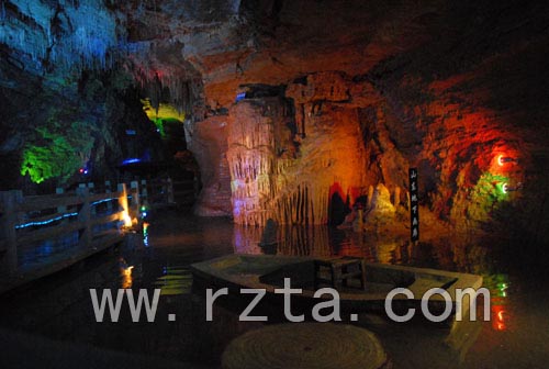 在画廊溶洞入口的前面,是一条幽静的山谷,两岸是陡峭的崖壁。一条人工栈道悬挂在崖壁之上,人行其上,如同画中畅游,栈道是游人进入“江北第一溶洞”的通道。如果说,溶洞内千姿百态的钟乳石是大自然鬼斧神工的造化,洞外则是一幅展示生态之美的山水画卷。水是山的灵魂,山中没有了涓涓泉水,就少了一份灵气。清澈的山泉在溶洞中汇集,形成一条地下河,河水从洞口流出,顺山势飞流直下,在山谷中汇成湖泊,名曰:雾凇湖。
