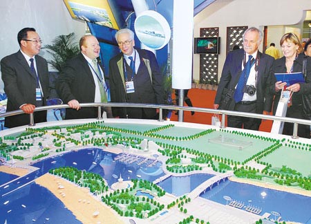11月3日,几名外国友人正在南京国际博览中心观看日照奥林匹克水上公园沙盘模型。当日,由联合国人居署设立的第四届世界城市论坛在南京开幕。我市在论坛展区设立的宣传展台吸引了国内外众多参观者,他们对我市的城镇化建设成就和优良的自然环境赞叹不已。