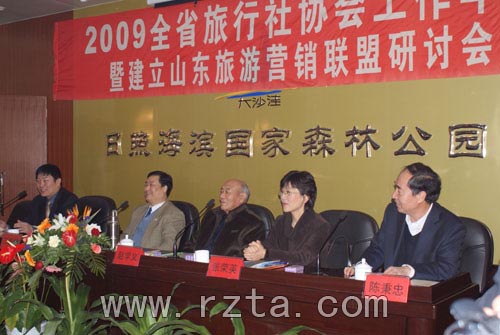 山东省旅游行业协会专职副会长丁再献、旅行社协会会长赵学义、副会长陈秉忠、日照旅游局副局长张荣英、东港区副区长姜毅到会并讲话,共同讨论在金融危机影响下旅游企业怎样抱团取暖、旅行社与景区合作等问题。在会上,本着“整体营销,捆绑销售”的原则,为确保旅游企业减少成本扩大成效,在省旅行社协会的倡议下,建立了山东旅游营销联盟。