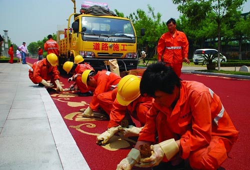 6月2日,施工人员在为万平口景区的“玫瑰大道”绘制玫瑰花和心形图案。 据了解,位于万平口景区的“玫瑰大道”是我市首条红色沥青路,路面两侧绘制了999朵玫瑰花和999颗心形图案,与两侧的植被、建筑浑然一体,构成了一道独特的风景。