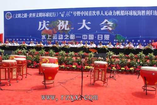 上午11点太阳广场人声鼎沸、锣鼓喧天,数千市民齐聚于此,等候翟默到来。庆祝大会由日照市副市长谢世增主持,出席庆祝大会的领导和嘉宾有:国家交通运输部副部长、中国“航海日”活动组委会常务副主任徐祖远,山东省省长助理陈光,海军原副司令员、军事科学院原政委张序三,中央电视台《文明之路》总导演亓克君,国家体育总局水上运动管理中心副主任李全海,中国帆船帆板运动协会秘书长姚新培,中国海事局副局长曹德胜,国家交通运输部水运院副院长费维军,省体育局副局长李政,山东海事局局长袁宗祥,省烟草专卖局副局长刘云生,山东中烟工业公司副总经理王众声,市委书记、市人大常委会主任杨军,市委副书记、市长赵效为,市人大常委会第一副主任周惠平,市委常委、常务副市长侯成君,市委常委、秘书长王斌,市委常委、日照军分区政委密首范,副市长解世增,市政协副主席王坤英,市政府秘书长陈刚。