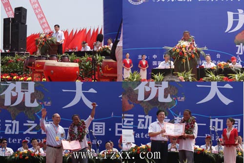 赵效为代表日照市人民政府向翟墨颁发“打造水上运动之都特别贡献奖”荣誉证书和奖金。为感谢主办单位、各位朋友和社会各界的关注和支持,翟墨特意准备了经过印度洋、大西洋、太平洋烈日和风雨洗礼的三面五星红旗,分别赠送给中央电视台、中国帆船帆板运动协会和日照市人民政府。