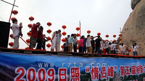 8月26日(七夕节)上午,2009日照第五届“情侣峰”相亲大会暨日照第一届“唇唇欲动、KISS有礼”接吻大赛在九仙山情侣峰隆重举行。日照市旅游局调研员、五莲山风景区管委会主任安榕平,日照市旅游局助理调研员孙开宏,五莲山景区管委会旅游开发局局长郑德武,日照市旅游信息中心主任田玉峰等领导出席活动开幕式。
