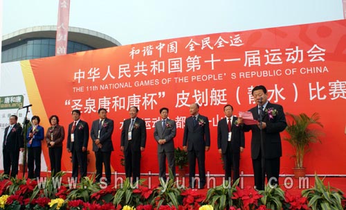 国家体育总局水上运动管理中心主任韦迪、水上运动管理中心副主任辛群英、水上运动管理中心办公室主任王茹、水上运动管理中心三部部长宋广礼、副部长罗冰,山东省体育局副局长李政、十一运会组委会竞赛部竞赛处副处长谈文新,日照市副市长、皮划艇竞委会主任解世增,赛区组委会副秘书长、皮划艇竞委会副主任、市政府副秘书长黄秀芹出席仪式。
