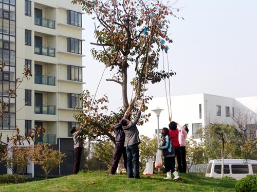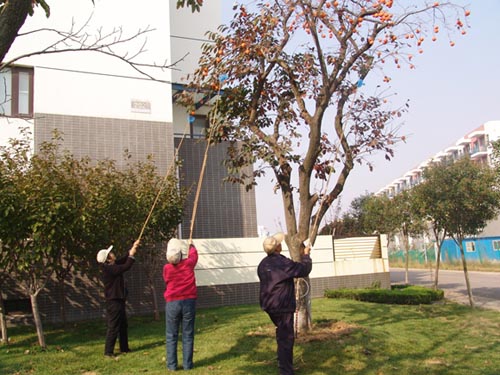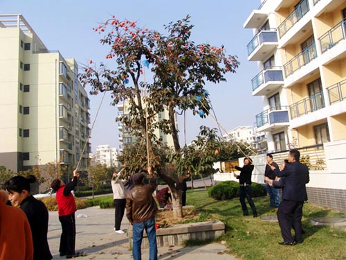 10月5日,秋高气爽,阳光明媚,“收获金秋 和谐邻里”教授花园第一届采摘节在教授花园三期举行。三期种植了20多颗柿子树,在业主和物业人员的共同维护下,每颗柿子树上都硕果累累,远远望去,像挂满了红红的“小灯笼”。