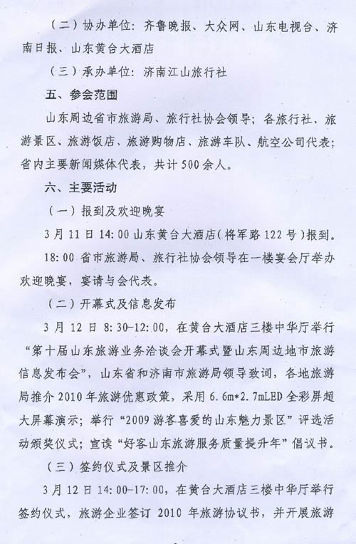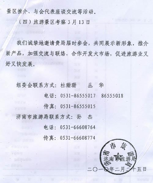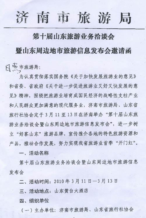 各旅游企业: 3月11至13日,济南市旅游局、山东省旅行社协会联合主办的“第十届山东旅游业务洽谈会暨山东周边地市旅游信息发布会”将在山东黄台大酒店举办,济南市旅游局给我市发出诚挚的邀请(详见附件),请有意参加的旅游企业于3月9日前将名单报市旅游局市场科,于3月12日14:00前到山东黄台大酒店报到。 附:第十届山东旅游业务洽谈会暨山东周边地市旅游信息发布会邀请函 二〇一〇年三月二日