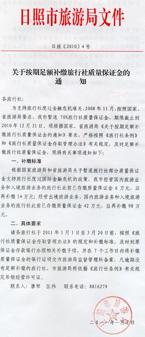 关于按期足额补缴旅行社质量保证金的通知(2011年01月14日)