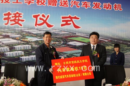 4月22日,现代威亚汽车发动机(山东)有限公司向日照市高级技工学校赠送汽车发动机交接仪式在日照高级技工学校隆重举行。市委常委、宣传部长、日照经济开发区党工委书记毛继春,日照经济开发区管委常务副主任李登来、副主任马维强,现代威亚汽车发动机(山东)有限公司李丙浩先生等出席仪式,仪式由耿光生书记主持。