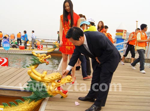 启动仪式结束后,日照市旅游行业龙舟大赛在奥林匹克水上公园龙舟码头赛场激情上演。上午9:30,市人大副主任梁云爱为龙舟点睛。
