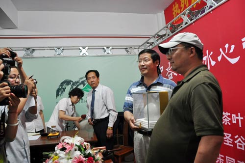 圣谷山茶场总经理高建华把这19.8万元的500克日照绿茶递交到王先生手上