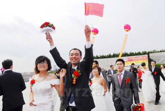 10月1日上午,日照市万平口演艺广场一片欢声笑语,到处洋溢着喜庆祥和的景象。25对新人与亲朋好友们一起合唱《今天是你的生日,中国》,把婚礼庆典仪式推向高潮,以独特方式共同庆祝祖国62周年诞辰。
