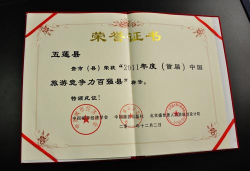 五莲县荣获“2011年度(首届)中国旅游竞争力百强县”称号(2011年12月07日)