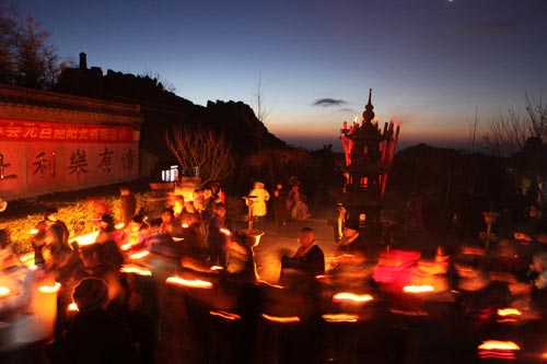 位于五莲山大悲峰前梵宇山光交相辉映的护国万寿光明寺为齐鲁唯一的皇家寺院。在这里,无论是悠远的钟声,新年的第一炷香,还是点亮居士前程的莲花灯都曾被历代文人骚客咏叹。撞响金刚钟寓意着去除众生烦恼,带着清凉吉祥进入新的一年;烧头香,是新春重要祈福形式,自古就有很多官宦商贾将来年的好运势寄托于头香的祈福,给来年一个吉祥的开始。千年光明寺更是秉承佛教弘法理念,是弘扬佛教文化的一方净土,2012龙年到来之际,为做好“好客山东• 多彩日照--五莲贺年会”中的“贺年福”,为秉承佛法教义,弘扬佛教文化,沿袭中国迎新传统习俗,弘扬中华传统美德,以及挖掘千年光明寺皇家内涵,五莲县隆重推出“光明寺钟声祈福,千人争烧岁首香”为主题的新年祈福感恩会,一盏灯,一颗心,一句祝福,一碗光明福粥、一场法事,带来的是真诚的祈福和一年的祥瑞。