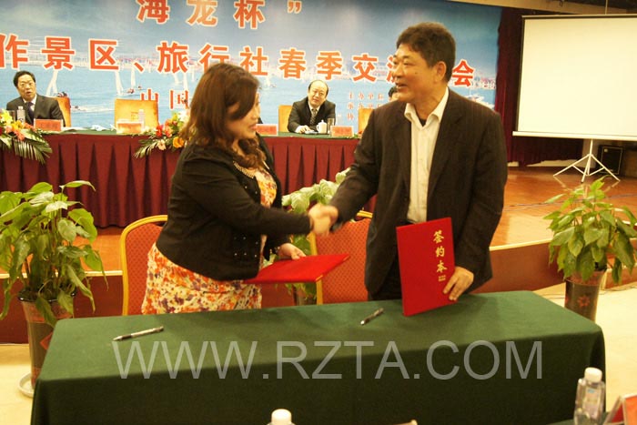 随后,孙开宏宣读了日照市旅游奖励办法,为友好合作景区和指定地接社颁发铜牌,并签订合同。
