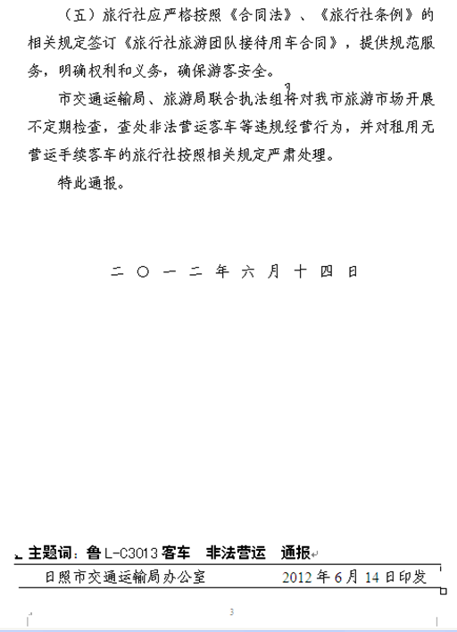 关于鲁L-C3013客车非法营运查处情况的通报(2012年06月26日)