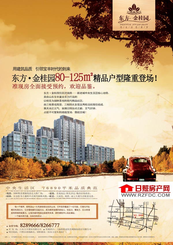 用建筑品质 引领宝丰时代的到来 东方·金桂园80-125㎡精品户型隆重登场! 准现房全面接受预约 欢迎品鉴。 东方·金桂圆位距济南路——新老城区中央生活区核心地带,是由山东宝丰置业亲力打造。以桂花为圆脸景观的现代精品社区,由三栋景观高层,三栋阳光多层及两栋沿街商住组成。乘天地之元气,坐拥日照东岭之巅,王气所钟。占据不可复制的绝版宝地,傲视全城! 金贵专线:8289666/8289777