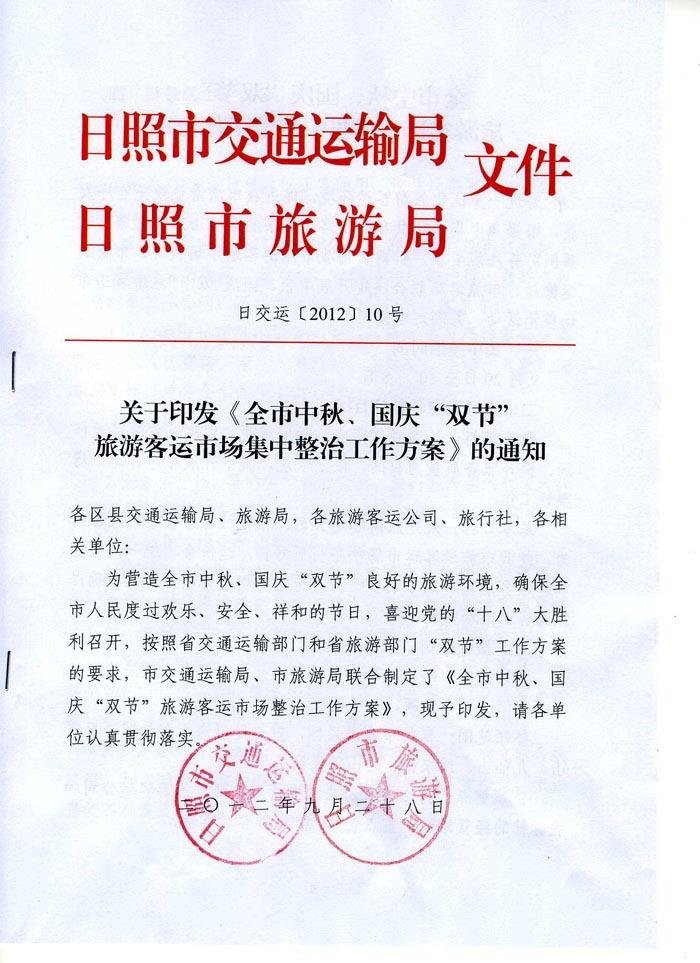 关于印发《全市中秋、国庆“双节”旅游客运市场集中整治工作方案》的通知(2012年09月29日)
