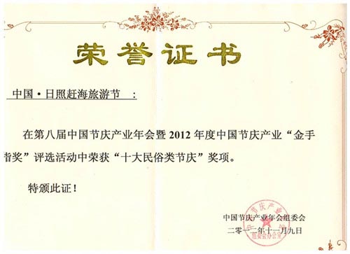 “中国·日照赶海旅游节”在上海举办的第八届中国节庆产业年会暨2012年度中国节庆产业“金手指”评选活动中荣获“十大民俗类节庆”奖项。