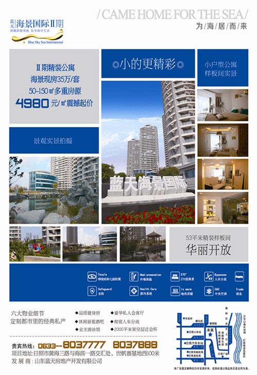 万顷碧波,一席私宅。蓝天•海景二期精装公寓4980元起,50—150㎡海景现房,35万即可享有。六大物业细节,定制都市里的经典私产。 蓝天海景国际总建筑面积110000,位于东港区黄海三路与海滨一路交汇处。紧邻920万平方米奥林匹克水上公园,其中包括世帆赛基地、游艇俱乐部、万平口生态广场及海水浴场、水上运动基地、灯塔广场、太阳广场等景区,由5栋32层1栋23层建筑组成。一楼为架空层设计,层高三米,仅为851户成功人士量身打造。 详情咨询热线:0633-8037777 8037888