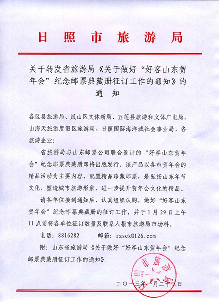 附:山东省旅游局《关于做好“好客山东贺年会”纪念邮票典藏册征订工作的通知》