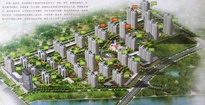 京泰•盘龙湾项目,位于沙墩河畔,占地面积212亩,总建筑面积50万平米。项目容积率 2.49,绿地率40%,建筑密度22%,是迄今日照最大的房地产开发项目之一,项目建成后将形成集托幼 、休闲、娱乐、居住为一体的高尚住宅区。