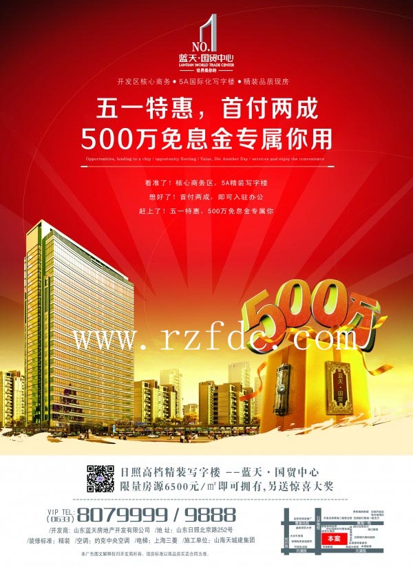 蓝天国贸中心五一特惠,首付两成,500万免息金专属你用。 蓝天国贸中心坐落在北京路252号(日照经济开发区管委对过),占地面积7000平方米,总建筑面积41000平方米,单层面积是1400 平米,可以根据需要任意组合打通。主楼25层,地下2层,内部配有银行、高档餐饮场所、会议室、健身房等,大厦区位优越,正对面为鲁南(日照)航贸中心,是鲁南地区唯一的“一站式”通关平台,成就先天性国际商务平台;交通便捷,运总汽车东站、火车站、码头,近在咫尺,公交网络密集,5、11、12、19、21、22、24、26、31、303路公交车均经过此地,周边配套齐全,学校、商场、医院、生活小区及健身场所一应俱全,将极大的方便业主的工作、生活和休闲娱乐;距海不足3公里,办公之余凭窗远眺,可休息养神。 蓝天国贸中心是日照市首席实现办公智能化、楼宇自动化、通讯自动化、消防智能化、安保智能化的5A级国际化写字楼。 蓝天国贸中心贵宾热线:0633-8079999 8079888