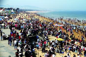 在日照市灯塔风景区,人数并不比森林公园内的少。虽然现在海水温度尚不足以洗海水澡,但是大批的游客还是来到了沙滩看海。其中一家三口开车来此看海的数量众多。据悉,万平口景区高峰停车达1500多辆,其中一半以上是外地牌照车辆,以省内、河南、河北、江苏等地最多,北京、上海等地车辆明显增多。
