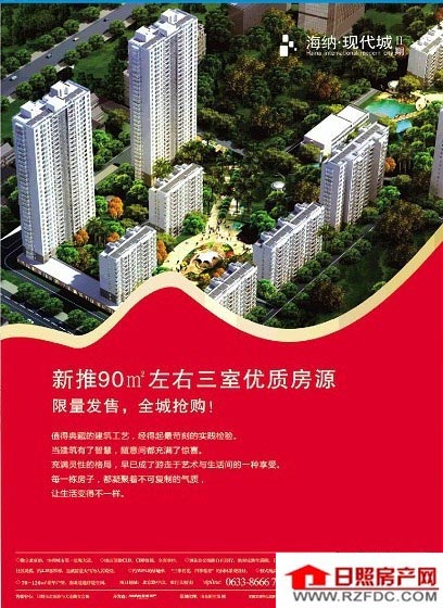 海纳·现代城Ⅱ期新推90㎡左右三室优质房源,限量发售,全城抢购! 相关链接: 海纳现代城二期(金桂园)位于石臼经济开发区,东临日照市第一景观大道——北京路,南临开发区管委、航运大厦,北临农行大厦,地理位置商业金融气息浓厚,升值潜力巨大。 海纳现代城二期项目占地5万多,建筑面积12万多,容积率是2.25,绿化率是36%。小区内庭院式景观设计,基本做到三季有花,四季常青,可让您在繁忙的都市生活中享受闲庭信步的悠闲。楼体外立面设计简洁时尚,是现代人士的绝佳选择。