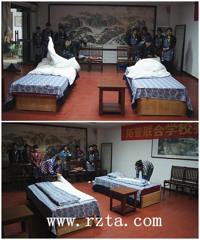 此次的技能项目为客房服务考核。考生们个个精神抖擞,考风严谨,技能技巧点到为止,很有一派专业服务人员一丝不苟的工作态度。据介绍,参加本次考试人员所穿的服饰、考试物料都是由学校提供,在面料花色的选择上,充分考虑民俗旅游村所接待的客户群体的特点,最大限度的让旅客能够有耳目一新的感觉。客服服务技能的考核,每五人一组,从甩单、被套、枕头、特色渔家饰品的摆放,最后的茶水服务,一切明确分工,有条不紊。考场如火如荼。