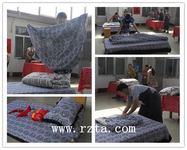 理论知识考核开考前,工作人员认真核实考生们的准考证,并为参考人员按小组分发了考试专用笔,细心地讲解了如何填写答题卡及注意事项。客服服务技能的考核,每五人一组,从甩单、被套、枕头、特色渔家饰品的摆放,最后的茶水服务,一切明确分工,有条不紊。