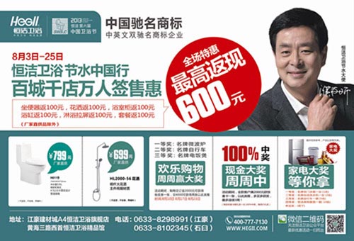 2013年恒洁第六届中国卫浴节盛大开启。8月3日-25日,中国卫浴驰名商标、中英文双驰名商标企业恒洁卫浴节水中国行百城千店万人签售惠活动强势来袭港城。 活动期间,购买卫浴器具返现金,除厂家直供品外,坐便器返100元,花洒返100元,浴室柜返100元,浴缸返100元,淋浴拉屏返100元,套餐返100元。厂家直供特价推出坐便器明杆大花洒各一款,超低价实惠到底。为更加回馈港城百姓,活动期间交订金及购买一定金额产品均可参与抽奖,名牌家电等你拿,还有百分百中奖率的现金大奖周周中! 活动地址:江豪建材城A4恒洁卫浴旗舰店 电话:0633-8298991 黄海三路西首恒洁卫浴精品馆 电话:0633-8102345