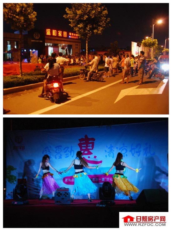 8月4日晚,为答谢广大市民的厚爱,盛和家园在售楼处举办消暑纳凉晚会。工作人员一早就搭好了舞台,摆齐了座椅。下午五点开始,辛苦了一天的市民就陆续来到现场抢占好位置,到晚上七点半晚会正式开始时,售楼处已被围得水泄不通。