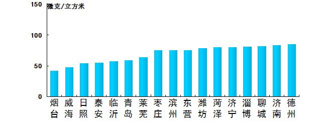 7月份,细颗粒物浓度最好的城市是烟台,为42μg/m3,最差的城市是德州,为85μg/m3。