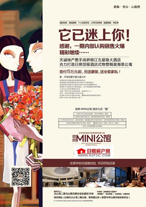 岚桥﹒MINI公馆项目总建筑面积近5万方,按五星标准装修配套,集居住、商务接待、旅游度假、学区陪读等多功能于一体。 项目 由1#-A、1#-B两栋楼组成,主楼总层高29层,其中一层为公寓入户大堂;二层设有星级会所,内设健身中心、咖啡厅、商务会客室、桑拿房、壁球室等高端配套设施;3—25层为精装平层公寓;26-28层为精装LOFT公寓;29层为精装复式公寓,户型面积45㎡-50㎡。项目依托岚桥集团旗下五星级岚桥锦江大酒店顶级服务,可享受业主专属的就餐、会议、娱乐等VIP贵宾服务。 区域交通: 项目地址在山海天旅游度假区太公岛二路以南、青岛路以东。青岛路纵贯日照市山海天旅游度假区、新市区、石臼三大主要经济旅游区域,东临碧海路,沿途纵览日照沿海美景。 地段价值: 项目位于日照市山海天旅游度假区内,为国家级旅游度假区。这里集蓝天、碧水、青山、绿树和金色沙滩于一体,多年来“空气质量为一级”、“海域水质为一类”、无任何工业污染,这在工业发展迅猛和城市污染严重的今天已是非常难得,日照市联合国人居奖的获得也是依靠这里的自天然环境。 项目北边为国家森林公园,南边是行政文化中心新市区;西边是日照大学城教育区;东边是阳光海岸金沙滩旅游区,黄金区域、核心位置,奠定了项目的地段价值! 投资回报: 项目投资回报政策采用时下成熟的物业托管服务,每年获得稳定的投资回报。传统住宅的收益方式是房屋增值+出租,而自己出租往往由于没时间打理、而且经常会出现由于没有租客出现闲置情况,出租收益得不到稳定保障。而托管式经营:这种方式最大的特点就是专人维护定期收益。在传统中介“只帮你把房子租出去”的基础上,又加进了后期维护、代为管理等延伸服务。并依靠专业公司进行宣传和推广,广泛收集供求信息,在房主和租客之间建立网络平台,这样既为房主解决了后期维护和房屋空置等难题,又让租客能够享受到细致专业的服务。 因项目所处日照旅游核心区域,随着城市发展游客住宿需求逐年增长,旅游旺季5月-10月住宿房源饱和,供不应求,项目依靠专业的托管公司运营,利用托管公司的网络平台把项目面向全国进行专业的宣传和推广,使客源上能得到完全的保障。公寓面积小,投入资金少,回报比传统住宅、写字楼更有优势。