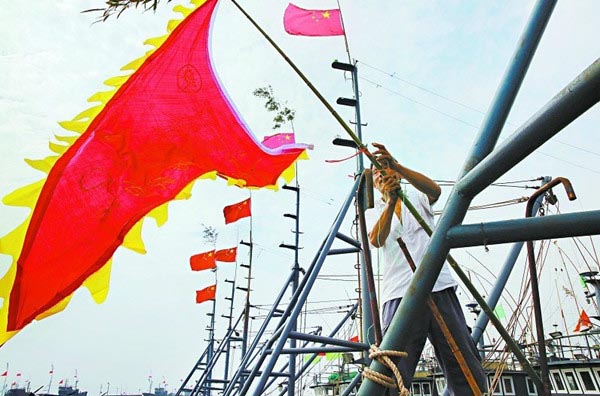 8月29日,日照阜鑫渔港的渔民们正在为渔船升旗,期盼开海后满载而归。黄渤海伏季休渔期将于9月1日12时结束,渔民纷纷忙于渔船出海前安全检查,准备出海作业物资,为开海做好准备。
