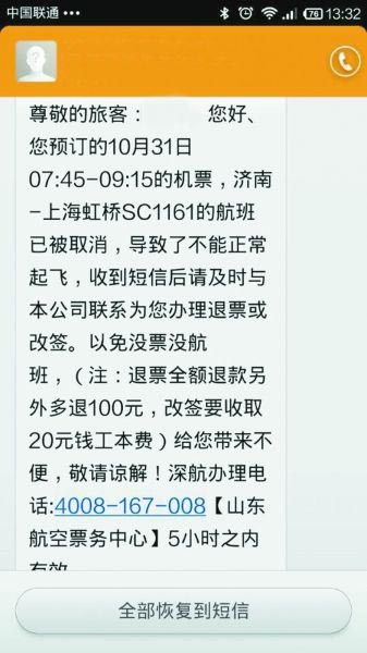 近日,有乘客在微博爆料质疑其个人信息被山东航空公司泄露,他在某网站订机票后,收到一条飞机故障航班被取消的信息,称客服可全额退票并补偿100元,改签只需缴纳20元手续费。而且短信中所写的姓名、航班号皆符合。在与航空公司确认后,乘客发现这是一条诈骗信息,其经历迅速引发网友关注。北京青年报记者调查发现,有大量乘客与其有相似经历,且均在同一家航空公司订票。 神秘短信告知航班取消 “今早突然收到一条诈骗信息,打电话问了客服,太可怕了!”网友济南陶冉发布了这样一条微博。在陶先生向北青报记者展示的那条诈骗短信中明确地写出了乘客的姓名、所乘航班号,还写了因为航班取消,通知乘客及时办理改签。同时,短信里给出的条件非常优厚:退票全额退款另外多退100元,改签要收取20元钱工本费。该短信落款为山东航空票务中心。 陶先生表示,他并没有回拨这个客服电话,而且查询了山东航空公司的注册电话,被告知航班一切正常。网名孙哲GRAZIA的网友在贴出自己收到诈骗短信后称,昨夜听说一位同样订山东航空公司从威海飞济南航线的乘客受骗,卡内四万元被转走。北青报记者调查发现,收到神秘短信网友大量存在,并质疑山东航空公司涉嫌泄露自己信息。 航空公司否认泄露乘客信息 昨日下午,山东航空公司在其微博回应称,近期山航客服热线陆续接到旅客反映,在购买山航机票后收到不明手机号码发送的短信,短信中冒用山航官方名义发布虚假航班信息,要求旅客拨打他们提供的虚假客服电话办理退票或者改签业务,并收取一定手续费,待旅客拨打电话后,进一步蒙骗旅客在ATM机上进行转账,盗取银行卡信息,继而实施经济诈骗,山航提请乘客对诈骗信息提高警惕。 山东航空公司表示,经警方立案侦查后,经一系列技术手段调查取证,初步排除旅客信息经山航自身渠道泄露的可能。如有航班变更,山航客服中心会主动联系旅客办理机票变更业务。 机票代理商:山航员工订票也收诈骗短信 网友大宁宁告诉北青报记者,她是一名山东青岛某机票代理商工作人员,在昨天一天中受理了近10个收到诈骗短信的乘客咨询,有乘客相信了诈骗短信,以为航班取消没去机场,结果错过航班耽误了事情。目前都是当天收到次日航班取消的短信,且都出自同一家航空公司。据她透露,山航自己的员工订票也一样收诈骗短信。 大宁宁告诉北青报记者,机票代理商会将乘客的订票信息直接发到山航订票后台,代理商方面不可能泄露乘客信息,“谁会去砸自己的招牌呢?”据她推测,山航也不可能主动泄露信息,而系统有漏洞被攻击的可能性比较大。 记者暗访:通过聊天软件进行转账协助 北青报记者通过陶先生提供的诈骗短信,拨通了这个神秘的客服号码400-816-7008,随即一个自称山航客服人员的男子接通电话。记者拿事先查好的一航班信息向该男子求证,被告知飞机已因故取消,随即男子反问记者:“山航早已向该班次旅客发布通知,您怎么刚知道?”记者袒露需要客服帮助改签的意向,该男子解释称,如退票,本公司可全额退还票款并多加一百元,如改签,可现在办理并收取20元工本费。 记者佯称次日出差,该男子提出将上午航班改签至下午,并称该航班仅剩三张票。记者表示需要预留,该男子随即表示记者需要提供银行个人储蓄卡号,并解释称不能使用信用卡,因该公司将开启银行对接平台,用信用卡无法核实卡主人身份信息,随后,电话被转至公司“票务中心”处,一名自称“改签部”钟姓男子先记录了记者卡号,并要求现在用电脑登录该银行卡网银账号,称公司已开启该银行收款链接对口,只需输入一个转账链接账号,打钱就可以了,成功之后会收到短信通知。 记者表示准备就绪后,该男子突然提出需要加一下改签客服部QQ号码。记者表示改签手续过于麻烦,欲直接去机场办理,该男子急称机场无法改签,而必须通过该公司。记者和这个QQ号加为好友后,该男子称需要通过QQ向记者发送一些操作流程的图片,让记者点屏幕中的确定键。记者发现,男子利用记者的操作实际开启了该聊天软件中的功能“远程控制”,该男子在控制了记者屏幕后,并打开记者网银支付页面,欲进行转账操作,记者赶紧中断使用这一功能。