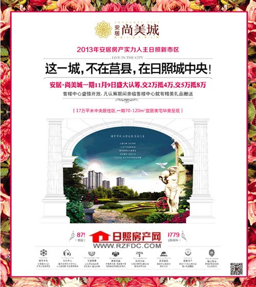 2013年安居房产实力入主日照新市区。这一城,不在莒县,在日照城中央!安居尚美城一期11月9日盛大认筹,交2万抵4万,交5万抵8万售楼中心盛情开放,凡认筹期间亲临售楼中心就有精美礼品赠送!17万平米中央居住区,一期70-120平米宜居美宅华美呈现!