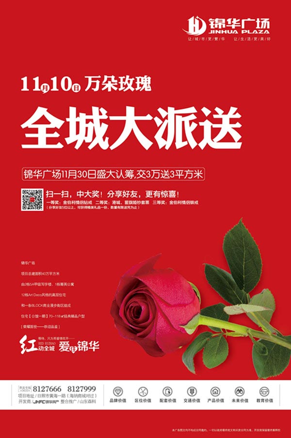 二百多人组成的送花天使将从锦华广场销售中心出发乘坐专车去往日照各大人气场所为来往的路人免费派送红玫瑰花,收到玫瑰的年轻男女们还可通过关注锦华广场公众微信抽奖的形式赢得价值数千元的爱情钻戒、专业婚纱摄影套票等众多爱情主题的好礼。另外现场还有乐队驻场演唱、爱情速配等多种主题小活动等,势必成为港城单身男女的爱情主场。感兴趣的单身男女朋友不妨到现场碰一碰运气;已婚的朋友也可到现场感受一下青春洋溢的爱情氛围,体味不一样的青春活力。