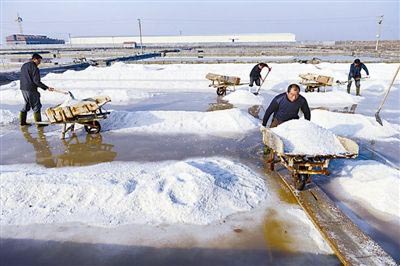 11月13日,在山东省日照市王家滩盐场,盐工们正在把今年最后一池盐堆起,用小车推到盐库储存。 日照市王家滩盐场成立于1958年,上世纪90年代有盐田1500多亩,年产盐1万多吨。如今,随着制盐成本的增加,大部分盐田已改成海水养殖区。