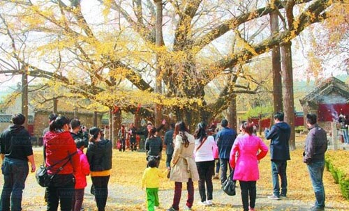 虽然已经入冬,日照旅游市场变得冷清,但浮来山景区定林寺里一棵4000岁的古银杏树却吸引了来自全国各地的众多游客。进入11月份以来,浮来山上的银杏树叶逐渐变黄,迎来一年中最美的光景。这几天,金黄的树叶开始飘落,定林寺里满院子都铺满了黄金叶,吸引了众多游客来赏景、祈福。记者在景区门口的停车场看到,挂有全国各地牌照的汽车停得满满当当,有的游客专程从北京、河北等地赶来一睹古银杏树的风采。游客们尽情地欣赏秋叶、拍照留念、抚摸着古树希望得到庇佑。孩子们大把大把地抓起叶子,向朋友的身上撒去……浮来山上一片欢乐声。 记者从景区了解到,11月份以来,浮来山游客人数大幅增加,每天数百上千名游客进山。浮来山景区也藉古银杏树,着力打造福寿文化,“人到浮来福自来,常到浮来福常在”,人们都心怀着对自己对亲友的美好祝愿。