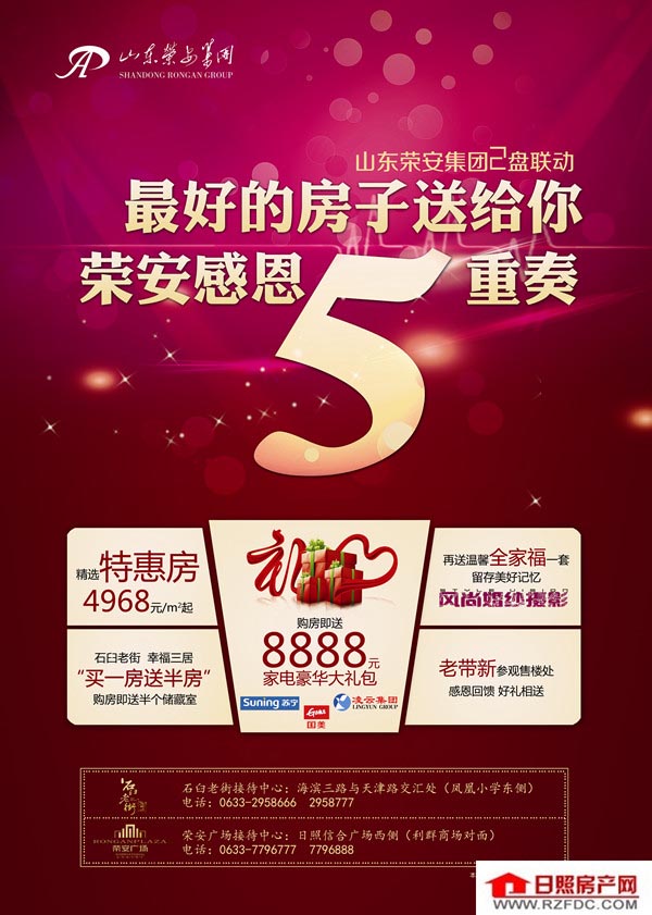 这是一个感恩的季节,每年11月的第四个星期四是感恩节,在这天,许多人会满怀温情地感谢曾经陪伴自己走过人生旅途的人。父母、妻子、儿女、朋友……一个爱心、一声呼唤、一片祝福都是是那样亲切而动听。 每一天,我们投身于繁忙的工作之中,我们奔波于不同的城市之间,你是否曾留意父母那渐渐增多的银丝华发,密密麻麻的写满岁月留下的痕迹;你是否关心过妻子繁重家务,奔波于社会与家庭而逐渐憔悴的脸庞;是否关心过孩子早出晚归,深陷在考学的压力,缺失的那份纯真。是否忽略了朋友创业的艰辛,多年不联系的友谊…… 城因人而美,人因情而生。在这感恩的季节,荣安集团倡导大家分享爱、传递爱、宣扬爱,让着这个寒冬成为感恩的季节。 自11月18日——12月18日荣安集团携旗下石臼老街、荣安广场联合苏宁、国美、凌云集团举办“荣安·感恩季”倾情回馈5重奏。 荣安集团全项目购房赠送8888元家电基金,自由购置家电用品。 全项目年终保留房源精选特惠房4968元起。 石臼老街幸福三居“买一房送半房”,成交客户即送半个储藏室。 全项目成交客户赠送温馨“全家福”一条,留存美好记忆。 老客户带新客户参观售楼处,老客户就能领好礼。 石臼老街:位于日照石臼天津路与海滨三路交汇处,凤凰小学东侧,距离海边仅三公里。处在浓厚的石臼居住片区,紧邻黄海一路繁华商圈,东临灯塔风景区,周边生活配套齐全,交通畅达。 电话:0633-2958666 2958777 荣安广场:是东关北路旧城改造项目,是市、区两级为民办实事重点工程之一。项目规划力求打造具有延续城市历史记忆的仿古商业街、高品质居住区的城市中心。东关北路区域改造项目作为2011、2012年度市、区为民办实事重点项目和市区的重点城建工程,集团计划投资约40亿,将其倾力打造成集商贸购物、餐饮休闲、旅游观光、民俗文化和专业特色于一体,融多元化服务、集约化经营、规模化发展的大型现代城市综合体。 电话:0633-7796777 7796888