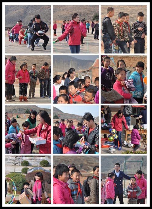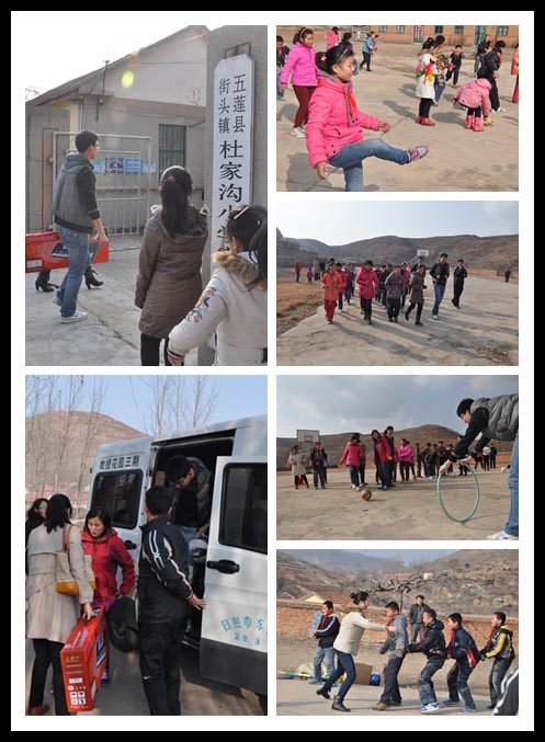 11月22日,位于五莲县街头镇的杜家沟小学热闹非凡,山海天城建集团“萤火虫助学行动”首站活动在这里启动。没有鲜花和掌声,没有领导讲话和华丽的开场白,迎接我们的是一张张质朴笑脸。我们给孩子们带来了篮球、足球、排球、羽毛球、跳绳、毽子、呼啦圈和学习用品。教授花园新里程的业主们也参与了此次助学活动,并为孩子们带来了体育用品和学习用品。简短的赠品交接仪式后,我们来到了学校操场,与孩子一起上体育课。山东体育学院的汤老师作为我们活动的志愿者,为孩子们准备了一场快乐丰富的体育课:老鹰捉小鸡、篮球传递、踢毽子、跳绳等。