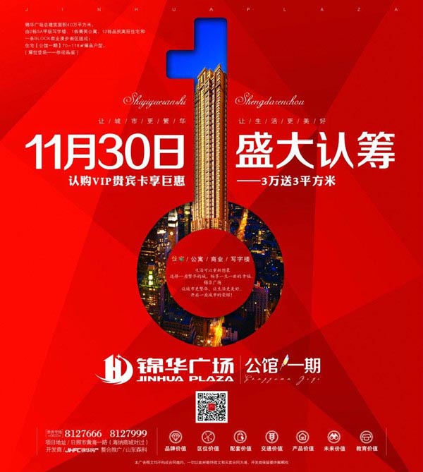 11月30日锦华广场公馆一期盛大公开认筹,交3万送3平方米,推出76-130 ㎡多种宜居空间,优质学区配置,为年轻刚需、投资人群首选,有置业需求的市民朋友可以到销售中心现场咨询,11月30我们不见不散!