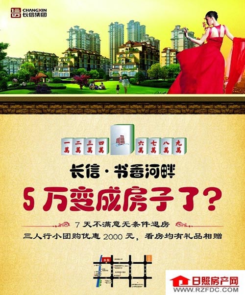 长信·书香河畔,超低首付,5万变成房子了?7天不满意无条件退房,三人行小团购优惠2000元,看房均有精美礼品相赠! 相关链接: 长信•书香河畔是长信房地产开发有限公司倾力打造的第一个住宅项目,项目位于日照市昭阳路369号,由高层、小高层、多层、花园电梯洋房和一栋占地面积2400平方米的幼儿园组成。项目东邻高科园的小学,西侧紧邻香店河,70-110㎡中小户型,轻轻松松安个家。