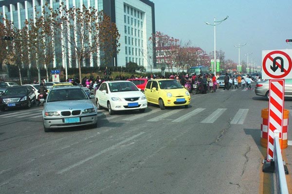 “中午下班回家开车行至此处,总是令人头疼,许多接孩子的家长把电动车停在了斑马线上,有的家长还把轿车停在了路口,不但影响交通,也存在安全隐患。”12月2日,家住金海岸小学附近的王先生指着威海路与莒州路交会处的车辆说。 当日11点30左右,记者来到了威海路与莒州路交会处附近。此时,已经到了学校放学时间,在老师以及家长护卫队的护送下,金海岸小学的小学生们排着整齐的队伍走出校门,有的学生登上了校门的校车,有的被家长接走了。在现场记者看到,在莒州路两侧停着了接学生的私家车,一辆辆私家车排起了长龙,也有家长把车停在威海路边上;在威海路与莒州路交会处一侧的斑马线上,有不少家长把电动车停在了斑马线上,斑马线上站满了家长,他们翘首等待自己的孩子;在这个路口上,还有几辆私家车停在了那里。 在这个路口记者观察了一会,由于接孩子的家长以及私家车太多,学生通过斑马线必须穿过人群,同时也造成了车辆通行速度大大降低,即使绿灯亮了,车辆通行速度也格外缓慢,不时有汽车喇叭声响起,在这个时间段,一个信号灯的时间通过的车辆有十几辆。直到11点55分左右,这里的交通才恢复正常运行。 “每个家长都想让孩子安全回家,心情可以理解,所以每天都有学生家长执勤,保证孩子安全通过斑马线。”一位护卫队的家长告诉记者,许多家长堵在了路口,客观上增加了学生通过斑马线的难度。金海岸小学一位执勤的保安人员也坦言,接学生的车辆太多了,有的家长随意停车,一到放学时间就会出现这种现象,他建议家长朋友少开车,这样可以减少空气污染,同时也能缓解拥堵现象。 (图一:几辆轿车停在路口)