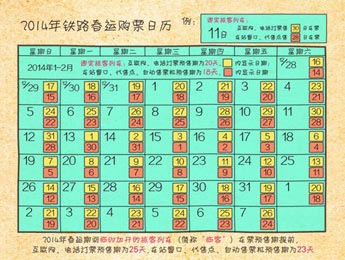 2014年铁路春运购票日历 中国铁路客户服务中心网站昨天发布了2014年春运售票公告,2014年1月16日-2月24日为2014年铁路春运时间。预定旅客列车互联网、电话订票预售期为20天。车站窗口、代售点、自动售票机预售期为18天。春运期间临客车票预售期提前。 公告称2014年春运,为进一步方便外出务工人员购票,铁路部门将提前面向用工企业和5名及以上务工人员自行组团办理务工人员团体往返票,办理车票范围为:1月16日-2月24日春运期间临时加开的临客车票。2014年春运期间有临客能力的车站,共162个。 另外,提前发售学生票,优先办理学生票,本月10日至19日,集中受理2014年1月10日至2月24日期间的学生团体往返票。 公告提醒,2014年春运期间,铁路部门对因旅客原因办理车票改签,且改签后车票的乘车日期在2014年1月16日至2月24日期间的,退票时按票面票价的20%核收退票费。 公告还公布了铁路售票人员的“七不准”纪律要求,欢迎社会各界和广大旅客给予监督。另外,铁路公安机关组织开展打击倒票“猎鹰战役”,依法查处倒卖火车票违法犯罪活动。各地铁路警方将向社会公布举报电话,对实名举报经查证属实并立案的,给予举报人100至500元奖励。 预定旅客列车互联网、电话订票预售期为20天,即2013年12月28日发售2014年1月16日(春运第一天)车票;车站窗口、代售点、自动售票机预售期为18天,即2013年12月30日发售2014年1月16日(春运第一天)车票。 2014年春运期间临时加开的旅客列车(以下简称“临客”)车票预售期提前,互联网、电话订票预售期为25天,即2013年12月23日发售2014年1月16日(春运第一天)车票;车站窗口、代售点、自动售票机预售期为23天,即2013年12月25日发售2014年1月16日(春运第一天)车票。 2014年1月16日-2月24日春运期间临客的全部票额,优先用工企业和5名及以上务工人员自行组团(以下简称“自组团”)办理务工人员团体往返票,用工企业和自组团的经办人请提前认真阅读《2014年春运务工人员团体票办理须知》(附后)。团体票办理流程如下: 1.企业用户申请 2013年12月8日至2013年12月16日,用工企业可从务工人员团体票办理网站(http://www.12306.cn/mwgweb/)首页下载《订购务工团体票协议》,打印并加盖企业及其法定代表人印章。 用工企业经办人到铁路部门公布的162个务工人员团体票办理车站(以下简称“办理站”,附后)专口申请办理务工人员团体往返票,申请时需提供以下材料: (1)有效的企业法人营业执照副本(带2012年工商部门年检合格章)和复印件; (2)加盖企业及其法定代表人印章的《订购务工团体票协议》; (3)经办人二代身份证件原件、手机号码、电子邮箱地址; 铁路部门确认后将为用工企业发放《务工人员团体票购票说明》,内含登录网站所需的用户名和初始密码。 2.提交购票需求 2013年12月11日至12月16日,通过申请的用工企业可登录务工人员团体票办理网站(http://www.12306.cn/mwgweb/)提交购票需求,自组团可由经办人在办理站专口提交购票需求,提交需求时需提供经办人二代身份证原件、手机号码和所有乘车人二代身份证原件,同时经办人要签署《订购务工自组团体票协议》(由车站提供)。 3.组织配票 2013年12月17日至12月20日,铁路局组织配票。 配票完成后,12306将向配票成功的自组团的经办人手机发送配票通知短信。 4.支付取票 2013年12月21日7:00至2013年12月22日23:00,用工企业可登录务工人员团体票办理网站(http://www.12306.cn/mwgweb/)查询和确认配票结果,选择“网上支付”或“窗口支付”。在网上支付的,支付成功后可凭乘车人二代身份证原件到任意窗口或自动售、取票机上换取纸质车票。在窗口支付的,可凭乘车人二代身份证原件直接支付取票。 自组团经办人在接到12306通知短信后,可于2013年12月22日23:00前到任意窗口凭乘车人二代身份证件原件支付取票;需调整乘车人时仍需到办理站专口凭订单号和乘车人二代身份证原件办理。 凡发售的务工人员团体票票面均打印“团”字,退票按照客规规定,必须在开车前48小时以上办理退票手续。网上支付成功的车票,未换取纸质车票前,改签需到车站窗口办理。 自2013年12月25日起,用工企业和自组团仍可持乘车人二代身份证原件到所有车站专口直接购买务工人员团体票。已通过申请的用工企业可直接报企业名称或用户名购票,未通过申请的用工企业须提供与提前办理时相同的材料。 (一)优先办理学生票 1.互联网集中受理:2013年12月10日至19日,哈尔滨、沈阳、北京、呼和浩特、西安、成都、昆明铁路局和广铁集团开通互联网渠道,集中受理2014年1月10日至2月24日期间的学生团体往返票。办理流程为:第一步,院校在网站提交订单,第二步,铁路部门配票,第三步:院校支付取票。 2.车站专口受理:自2013年12月10日至12月19日,其他铁路局在有图定始发列车和有硬座票额的车站设立专口,集中发售2014年2月24日前的学生团体往返票。 3.自2013年12月20日起,互联网、电话订票、车站窗口、代售点等同步发售2014年2月24日前的学生票。 (二)自动售(取)票机提供售(取)学生票服务 车站设置的自动售(取)票机均增加售(取)学生票功能;在部分规模较大的院校,经学校同意后,逐步设置自动售(取)票机,方便学生购(取)票。 在自动售(取)票机上购(取)票的学生旅客,须提前到学校相关部门确认自己的学生火车票优惠卡内已写入姓名、二代身份证号码、乘车区间、