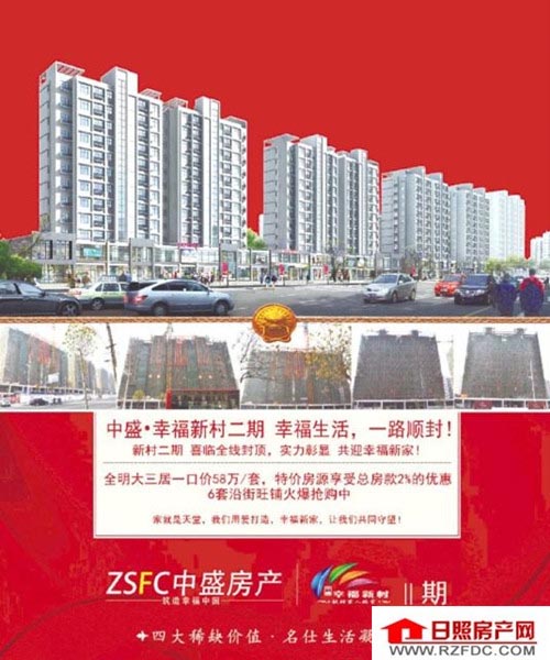 中盛幸福新村二期,幸福生活,一路顺封!新村二期,喜临全线封顶,实力彰显,共迎幸福新家! 全明大三居一口价58万/套,特价房源享受总房款2%的优惠,6套沿街旺铺火爆抢购中! 相关链接: 幸福新村新村项目由日照中盛房产公司开发,总占地面积33亩,规划建筑面积55000平米。中盛幸福新村周边生活配套设施齐全,步行几分钟就可以到达银行、商场、医院、市场、酒店、公园……楼盘周边还有成熟的教育配套,日照港二幼、港二小、石臼街道中心小学、新营中学南校区、日照六中近在咫尺,与凤凰小学仅一路之隔。 日照房产网为您带来中盛幸福新村项目地址:天津路与海滨四路交汇处