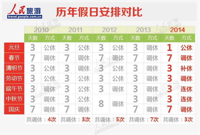 历年假日安排大对比:2014年将减少4次调休(图)(2013年12月12日)